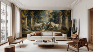 It's a very dramatic and classical mural depicting a scene with two white bulls against an elegant, ancient background; the bulls, in a dynamic pose, overgrown with rich vegetation on all sides, flanked with imposing pillars that speak to the grandeur of Roman or Greek Classical architecture. Herein, a sumptuous gold-and-shade-filled color palette imparts a quality of timeless beauty. Perfect for spaces that demand a touching union of nature, mythology, and classical finesse, this mural creates a far-reaching and imperious atmosphere. It will work well in living rooms, studies, or galleries.