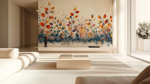 This wallpaper mural has a soft leaves design in a watercolor painting style in warm fall colors. A mix of orange, rust, and deep gray-blue colors goes well together in this leaf design without making it feel too fussy in any room. The abstract style, created by hand painting, is stylish for any living room, bedroom, or bedroom. For people who like nature-based decoration, the mural gives a warm seasonal charm without deviating far from a basic look.