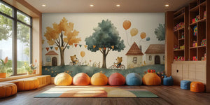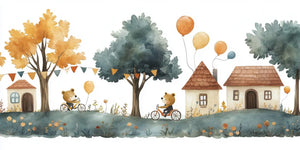 Make your child's bedroom fun with our Whimsical Bear Village Kids Wallpaper Mural. This mural shows cute bears happily riding bikes in a charming village. The scene features charming houses, lush trees, colorful balloons, and festive decorations. It beautifully captures the magic of childhood. Soft browns, blues, and golden oranges in watercolor create a cozy, playful vibe. This setting is perfect for inspiring imaginative play and storytelling.