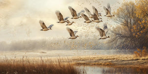 A mural wallpaper of birds flying over an autumn landscape with mist; the above scene whispers quiet moments in shades of beige, brown, and amber as those birds soar with ease over golden grasses and the stillness of a pond. Texturing and softly falling autumn leaves add a natural depth to the given design, which is apt for settings that need to appeal with a cozy and nature-based look. Suitable for the bedroom, lounge, or office, this mural will bring the glory of fall to your world and add class to any room with its serenity.