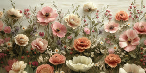 This mural wallpaper exposes the striking garden to softly colored pink, cream, and peach flower tints. Highly detailed poppies, daisies, and wildflowers bloom en masse on a softly textured background to create a scenery of delicate balance and enticing tactility. Perfect for adding that touch of nature and sophistication, this floral wallpaper mural brings restful and ageless beauty to any bedroom, living room, or dining area. It is perfect for anyone seeking out a classic botanical element with a modern, artistic twist.