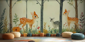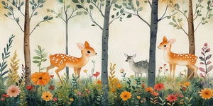 Transform your child's room into a magical forest! Use our Charming Deer Woodland Kids Wallpaper Mural. Friendly deer and their playful friends graze in a magical forest. This place has bright flowers, soft leaves, and tall trees. It sparks your child's imagination and encourages creative play.