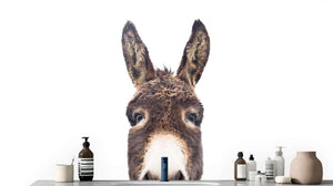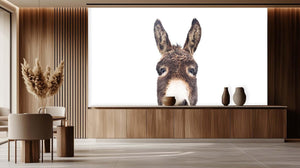 This captivating mural showcases a remarkably detailed portrait of a donkey, capturing its soulful expression and fluffy ears. The artwork draws the eye with its heightened perspective, offering an intimate glimpse of the donkey's friendly demeanor. With a soothing palette of soft browns, warm earthy tones, and the elegance of the white background, this wall mural infuses your space with a light and airy feel, perfect for modern interiors. The designer wall mural seamlessly integrates into a child's bedroom, a playful classroom, or a light-hearted office design.