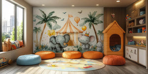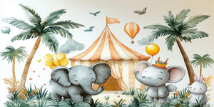 Brighten your child’s room with our Elephant Circus Celebration Kids Wallpaper Mural. It brings carnival fun right to their space! This cheerful mural features cute elephants, a cute bunny, and playful balloons. They stand in front of a bright circus tent, with stunning palm trees in the background. The bright scene is made for fun, imagination, and storytelling. It’s great for any nursery, playroom, or children's bedroom.