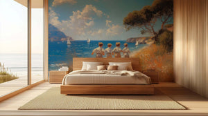 This colorful wallpaper mural presents a seascape in good weather: kids run happily along the lane that contours over brilliant blue waters. Sailboats are gliding atop the water amidst a sky of cotton-like clouds, while farther inland, in the distance, is a mountain range that adds depth to the background. This mural will add a hint of summertime nostalgia to any room. Perfectly warm, joyful, and free, it is a mural that spreads its spirit into your home. Great for living rooms, bedrooms, and children's playrooms.