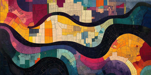 This abstract wallpaper mural is coming alive in a pop-art-like mosaic of colorful geometric shapes wandering across fluid, organic lines. Teal combines bright yellows, oranges, purples, blues, and greens to evoke an aerial map or an overhead city perspective. All the pieces are detailed with style, giving an energetic and rhythmic feeling to create life and movement in any room. Perfect for modern and contemporary settings, this mural adds a touch of style and art.