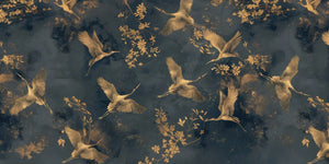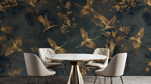 This mural wallpaper represents a sumptuous design: gold cranes flying across a deep, dark blue background. The details in every crane, with outstretched wings, create motion and elegance in the design. Moreover, slight touches of floral accents on delicate, subtly textured backgrounds will add sophistication and serenity to the design for any space. Suitable both in bedrooms, living rooms, or study areas, this mural adds natural appeal and timeless charm to interiors.
