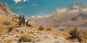 This enormous wallpaper mural reveals a beautiful desert landscape: rugged mountains and expanses of open plains- all under a brilliant, bright, vivid blue sky. Three explorers in classical attire stand beside a white horse, looking off into the distance, taking it all in. In exquisite detail, it captures the spirit of adventure and discovery: scenic nature with its rocky outcrops, a sprinkling of vegetation, and rising mountain peaks way higher in the distance. That can evoke feelings of openness and awe, perfect for a desert wallpaper mural that lets the wild and untamed outdoors come into a room for the adventurer or nature enthusiast.