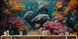 Take your child on a fun underwater adventure with our Dolphin Reef Kids Wallpaper Mural. This mural brings smiling dolphins and tropical fish to life. They frolic joyfully along coral reefs and calm ocean waters. It turns kids' bedrooms, playrooms, and nurseries into magical ocean worlds. Spark your child's curiosity and imagination with this eye-catching design of sea creatures.