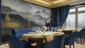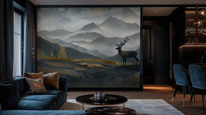 Transform your space with this stunning wallpaper mural, which majestically details a deer silhouette gracefully poised against the tranquility of a mountain backdrop. The design has soft gray and deep blue mountain ranges decorated with golden accents and ethereal mist in a hypnotic mix between nature and elegance. Great for living rooms, bedrooms, home offices, or inviting cabins, this mural brings a sense of tranquility and sophistication to a room. On it, the black figure of a deer stands with resolve in the foreground against its luxuriously golden brushstroke type and color. Perfect for every modern, rustic, and Scandinavian interior, high-quality murals adorn space with nature's grace while adding contemporary charm to houses.