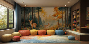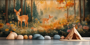 Transform your child's room with our Enchanting Deer Forest Wallpaper Mural. It brings a magical forest to life! This mural shows cute deer wandering through a magical forest. The forest is full of bright flowers, golden leaves, and glowing trees. It inspires imagination, storytelling, and creative play.