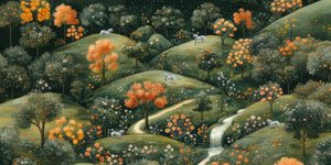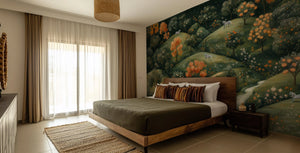 Nice wallpaper with a fairytale landscape: green hills colored by trees in orange and yellow. In the green, a white horse is standing calmly, alone, to give the scene its magic touch. Finishing nicely in view is a serpentine path with a small waterfall, dreamy and peaceful. This is a perfect mural for kids' rooms, nurseries, or any place that just needs that pinch of magic. It adds the beauty of nature indoors.