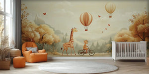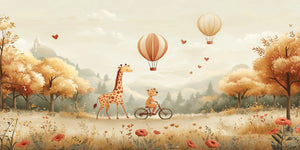 Transform your child's room with our Giraffe and Bear Friendship Adventure wallpaper mural. This cute design shows a bear happily riding a bicycle with a cheerful giraffe. They are surrounded by drifting hot air balloons and heart-shaped details. This mural brings warmth, friendship, and imagination to any room. It features a peaceful scene of fall leaves and soft, rolling hills.