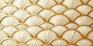 This gold-cream hue sets a fabulous tone for this fan motif mural wallpaper, which speaks to refinement and strongly reflects the Art Deco style. Delicate overlapping lines of fans and a soft 3D effect create depth and richness in this design that will be perfect for adding glamour to an interior space. This mural is great for living rooms, dining rooms, and bedrooms. It displays its luxuriousness and timeless elegance, working in complete harmony with modern and classic decoration.