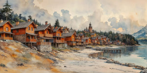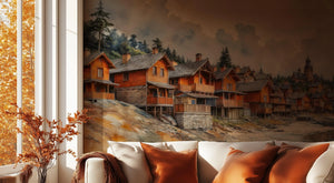 This beautiful mural reproduces the serene lakeside village with wood cabins excellently placed on the shores of the lake. A velvety backdrop of evergreen forests and snow-capped mountains reproduces a perfect scenario for a serene and natural environment. The delicate hue warms up the wood cabins in an almost watercolor-like tone. At the same time, the overcast sky enhances the serenity. This mural is ideal for bringing a rustic sense of calm into space, apt for bedrooms, living rooms, or offices, while beautiful and evoking the remoteness of scenic landscape vistas.
