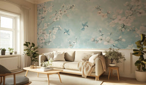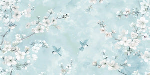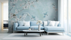 This beautiful light blue floral wallpaper mural will transform any interior with its unique design. Delicate white blossoms intertwine with charming birds flying on a soft pastel blue background. Perfect for creating a serene and elegant ambiance in bedrooms, nurseries, living rooms, or even workspaces. This wallpaper is made of high-quality material, is easy to install, is very durable, and is perfect for adding that touch of nature-inspired sophistication to your walls. Add serenity and beauty to your room with this elegant wallpaper mural.