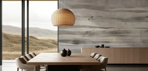 Delicate abstract patterns feature in this mural, created by strokes in gossamer shades of white, gray, and beige, with the underlies subtly in gold. The layered strokes create a soft, wave-like effect and give this mural a soothing effect- so very modern in appearance. Because of its simplicity, serenity, and polish, it is fitting for minimalist or contemporary settings. This mural will fit into the living room, bedroom, or office. Other than the sophisticated gold accents, muted colors create an air of luxuriousness without sacrificing the freshness of an open space.
