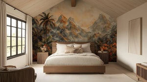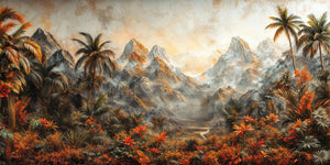 The mural wallpaper presents the vista of an exotic jungle landscape, where the mountains majestically rise upwards, with lush tropical vegetation in the foreground. Featuring lively green palm trees intermingled with bright reddish-orange foliage, it offers a backdraft of a warm, tropical ambiance. Mist-shrouded mountains create an air of mystery and adventure, with birds flying weightlessly above the peaks, adding even more wildness and freedom to the atmosphere. The perfect mural for bringing an exotic and natural look inside, this piece will be ideal as a lively, immersive background in your living room, bedroom, or office.