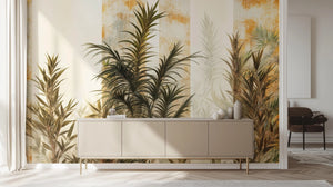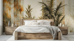 With its tranquil, long, green plants on a textured backdrop of warm tones of rust, ochre, and light beige, this mural will accentuate one's interior space. The layer adds depth, with soft shadows creating a lightweight, nearly transparent layer. This mural gives the rooms the impression of being natural, with botanical touches. It should be excellent in living rooms, bedrooms, or home offices for the desired serene environment. Great for those into rustic and natural decor, it fuses nature-themed artwork with a modern, worn look.