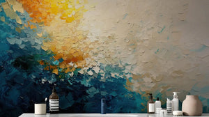 This mural wallpaper features an abstract painting that expresses texture in shades of blue, teal, yellow, and cream. This mural captures dynamic flow into colors, evoking the energy a sunset imparts to the ocean or the elegant play of sky and sea blended into each other. Heavy impasto gives this mural a three-dimensional effect and will add depth and movement to any room. It is perfect for adding color and an artistic flair to the living room, bedroom, or any creative space; the mural will create a vibrant yet soothing atmosphere.