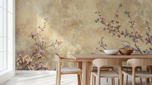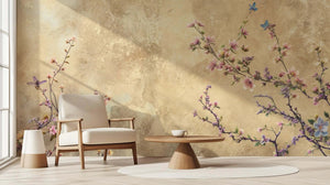 This mural design features flowers and branches on a soft, beige-textured background intermingled with blooms in shades of pastel colors, including butterflies and other details that give serenity in a naturalistic manner. Another indoor space would be the classic elegance featured just by the color and light design of the main rooms and bedrooms. These flowers burst with all of their soft shades on a neutral background, which works for modern and classic decoration in absolutely equal measure.