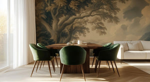 This mural depicts a quainter, nostalgic panorama: a tall, green tree underneath an atmosphere-enhanced sky. The coloration of the composition is in soft sepia and bluish tones, contemplating a quiet, striking atmosphere, which is common in traditional pastoral works. Rolling hills and faraway mountain ranges give the scene much depth, and high clouds evoke serenity and timelessness. It would be great for the living room, bedroom, or study areas. It adds nostalgia and the charm of nature indoors. Perfect for creating cozy moodiness with touches of elegance and naturality.