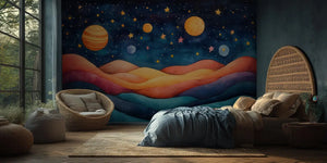 Take your child on a trip to a magical galaxy with our Galactic Dreamland Kids Wallpaper Mural! This beautiful space-themed design features a breathtaking cosmic world. It shows rolling hills in sunset colors. Bright planets and sparkling stars fill a dreamy watercolor sky. This mural sparks creativity and imagination. It transforms any child's bedroom, playroom, or nursery into a fantastic wonderland.