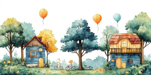 Transform your child's playroom or bedroom into a fun, creative space. Use our Playful Bear Village Kids Wallpaper Mural. Bear pals smile as they ride bicycles through a cheerful village. Cozy cottages and leafy trees surround them. Balloons drift gently in the sky. Soft watercolor hues of blue, green, yellow, and terracotta create a warm atmosphere. This setting encourages creativity, sparks curiosity, and invites imaginative play.