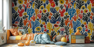 Brighten your child's room with our Playful Botanical Kids Wallpaper Mural. It adds energy, vibrancy, and joy! This mural bursts with bright colors like blue, red, yellow, and orange. It showcases fun plant shapes and playful flower designs. The art aims to spark imagination and passion. Perfect for nurseries, kids' rooms, or play areas. It brightens moods and sparks imagination.