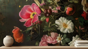 This floral wallpaper mural carries a timeless, vintage essence with its lively, classic botanical painting style. Featuring an assortment of flowers in full bloom—roses, poppies, and daisies in shades of pink, red, white, and green that speak of class and the beauty of nature—this wallpaper adds more depth with its mysterious dark background, letting these colorful florals rise with richness in great detail. Perfect for accent walls in a living room, dining area, or bedroom, this wallpaper evokes a romantic old-world charm.