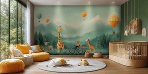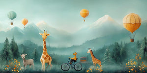 Turn your child's room into a fun safari adventure! Use our Safari Adventure Kids Wallpaper Mural! This whimsical scene features friendly giraffes and cute animals. Adorable hot air balloons float over beautiful mountains and dense forests. A cute bear rides a bike through the picturesque countryside. Many delightful hot air balloons soar in the distance. It fosters imagination, discovery, and limitless storytelling.
