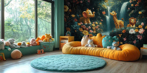 Add fun and adventure to your child's room with our Safari Friends Kids Wallpaper Mural. Cute animals like a sweet elephant, a goofy giraffe, and a grinning lion fill a vibrant jungle. It’s alive with bright flowers, thick greenery, and splashing waterfalls. This scene sparks creativity, imagination, and storytelling. The perfect decoration for nurseries, playrooms, or children's bedrooms.