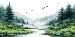 Create a peaceful haven for your child with our Serene Forest Kids Wallpaper Mural. Soft, misty mountains rise in the background. Dense foliage surrounds tall pines. Birds soar above a gentle stream that meanders peacefully. This view is truly relaxing. Soothing and beautifully made, it’s great for nurseries, bedrooms, and quiet playrooms. It invites rest, sparks imagination, and celebrates nature.
