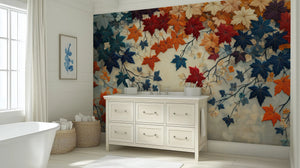 This Embroidered Leaf wallpaper mural comes in an autumn tone, in red, orange, deep blue, and teal tones. Like delicate embroidery, the detailed work presents a texture that could only impose warmth with hints of craftsmanship in every room. It's all about delicate floral accents and trailing branches that give this overall piece its air of sophistication, lending it eminently to create compositions with warm, natural atmospheres in a living room, bedroom, or creativity space. Perfect for adding that artistic, fall-themed accent wall.