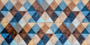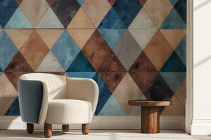 This wallpaper mural features a geometric pattern of interlocking triangles in a harmonious mix of earthy tones cooled with shades of blue, brown, beige, and gray. These triangular forms bring depth and visual interest to this geometric pattern—perfect for any modern, minimalist interior design. The muted colors and texture give this design a quiet, rustic feel, while the geometric layout brings it up to date in style. Perfect for use as a feature wall in a living room, office, or hall, this mural adds character to a space with elegance and class.