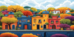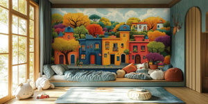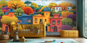 Brighten your child's room with our Colorful Village Kids Wallpaper Mural. The mural shows colorful, charming houses surrounded by leafy green trees. Bright hues of blue, yellow, orange, and green fill the scene. It creates a lively fantasy world full of storytelling, imagination, and adventure. Perfect for nurseries, kids' rooms, and play areas. It sparks children's creativity, letting them make their own stories.