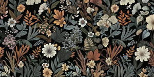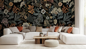 This mural wallpaper features a dark-colored backdrop with an intricate botanical design. This almost startling contrast develops the delicate details of flowers and foliage. It displays blossoming flowers, leaves, and texture in a range of muted tones like beige, olive, and cream to evoke a vintage, earthy style. This floral wallpaper mural adds style and class to your living room, bedroom, or office. Its unique design adds sophistication and organic class to your space. Perfect for those wanting nature-inspired yet very stylish decorations with a modern twist.