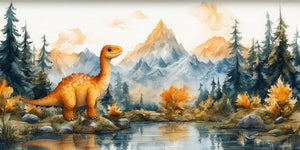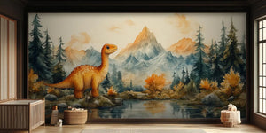 Transform your child's room into a dino paradise! Use our Dinosaur Adventure Kids Wallpaper Mural. A friendly dinosaur explores a stunning mountain range in this playful design. It adds a touch of fantasy and adventure to the space. The soft watercolor shades of blue, orange, and green create a warm, inviting feel. They are ideal for nurseries, playrooms, and bedrooms.