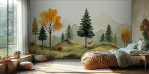 Turn your child's room into a magical forest. Use our Woodland Wonders Kids Wallpaper Mural. This mural shows a calm, rustic landscape. It features cute animals like deer, rabbits, and squirrels. The backdrop has rustic trees and rolling hills. This scene encourages a love of nature and sparks imaginative play.