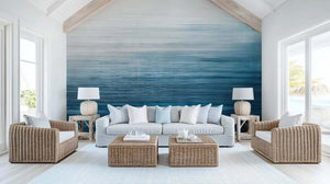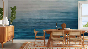 Bu duvar resmi sakin bir geçiş tonunda olup, durgun suların sessizliğini ya da sisli bir ufku anımsatır; tonlar kusursuzca karışmıştır: beyaz, açık mavi ve derin deniz mavisi. İnce yatay çizgiler, bu esere dokulu, dalgalı bir etki katarak sakin sularına—ya da sis içindeki manzarasına—daha fazla derinlik ve hareket kazandırır. Yatak odalarında, oturma odalarında veya çalışma odalarında huzurlu bir atmosfer yaratmak için mükemmeldir; bu resim her odaya sade, çağdaş bir stil getirir. Yumuşak renk düzeni rahatlama sağlar ve mekânın ve dinginliğin daha çok hissedilmesini sağlar.